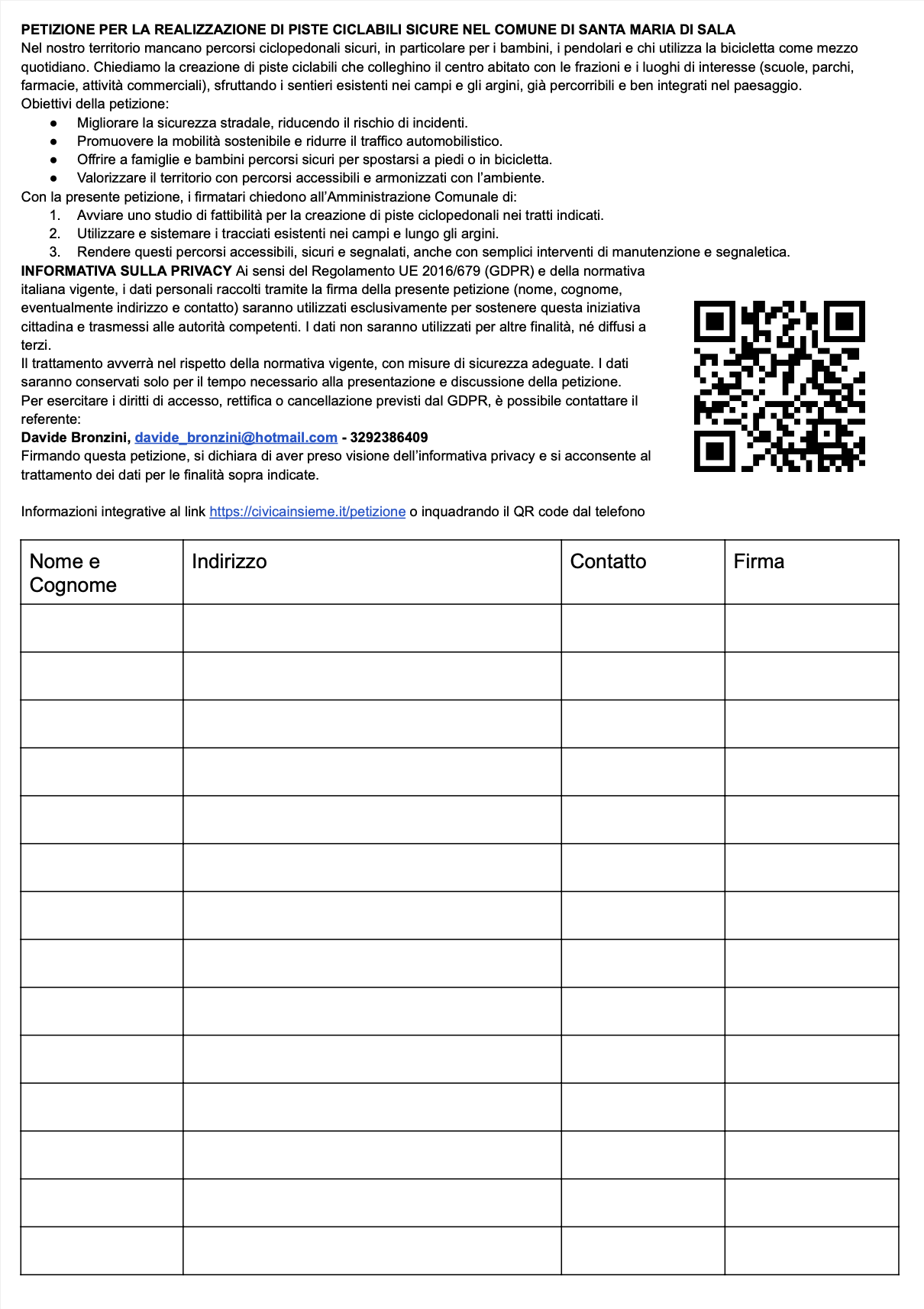 Scarica il modulo, raccogli firme, poi contattaci al 329 2386409 e noi passeremo a ritirare, magari in bici.